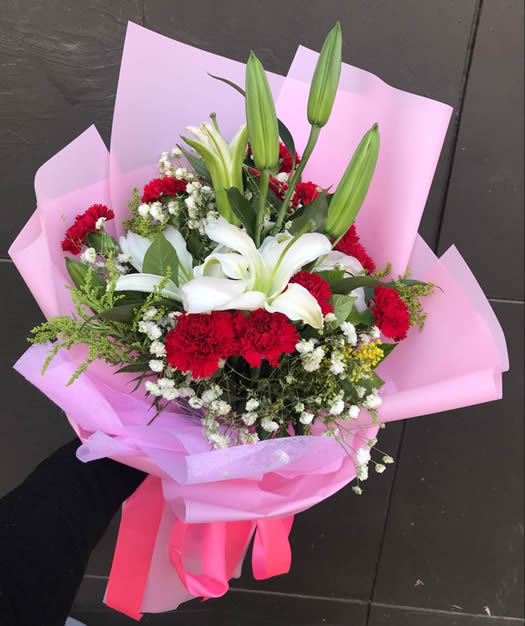 1支多頭百合,11支紅色康乃馨,黃英滿天星間插。紅色包裝。