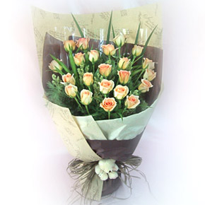 材料包裝: 「材  料」 香檳玫瑰19朵,(精美包裝港式豪華包裝)單面花束 「包  裝」 咖啡、淡綠、綿紙各1張3/4圓形包裝,內襯透明玻璃紙,咖啡色絲帶束扎
