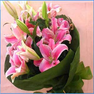 「材 料」 粉色多頭香水百合6枝 「包 裝」 進口手揉紙包裝,加配絲帶花。