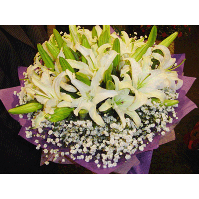 商品簡介: 「材  料」 9支多頭白色香水百合,下襯滿天星 「包  裝」 圓形花束 ,淺紫色手揉紙與綿紙雙層包裝,深紫色絲帶打結