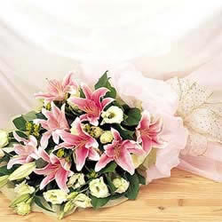 商品簡介:「材 料」 6支粉色多頭香水百合,白色洋桔梗多支陪襯 「包 裝」 淺粉色軟紗單面包裝,紗質絲帶花束扎