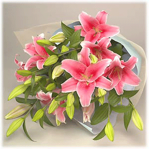 「材 料」 5枝粉色多頭香水百合,配黃鶯 「包 裝」 淡藍色皺紋紙圓形包裝,香檳色綿紙外面裝飾,藍色寬絲帶束扎