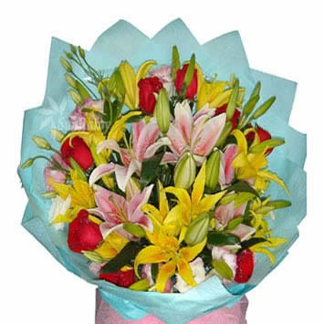 商品簡介:「材  料」 6支多頭黃色百合,2支多頭粉色百合,8支紅玫瑰,粉色桔;ㄒr托 「包  裝」 雙層藍色皺紋紙包裝成單面花束,粉色絲帶花蝴蝶結束扎