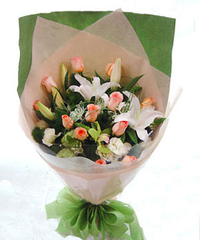 商品簡介: 「材 料」 12支粉玫瑰、2支多頭香水白百合、桔梗、配草若干 「包 裝」 綠色皺紋紙加棉紙內襯,淡粉色皺紋紙圓形。綠色絲帶