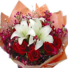 商品簡介:「材  料」 香水百合2朵(多頭一枝),紅玫瑰9枝,滿天星! 「包  裝」 婚紗紙圓形包裝。