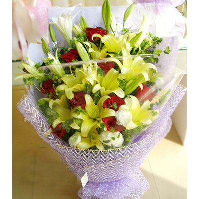 材料包裝: 「材  料」 3枝鐵炮百合,8枝黃花百合,9枝超紅玫瑰,綠草點(diǎn)綴; 「包  裝」 紫色皺紋紙加紫色紗網(wǎng)外圍,單面包裝。