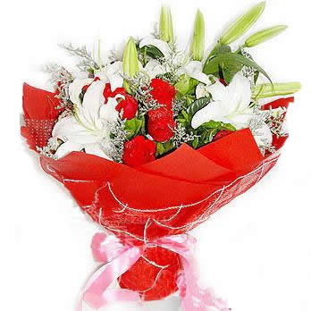| 材料包裝: | 「材 料」 2枝白色多頭香水百合,15枝紅色玫瑰,情人草豐滿,配綠葉