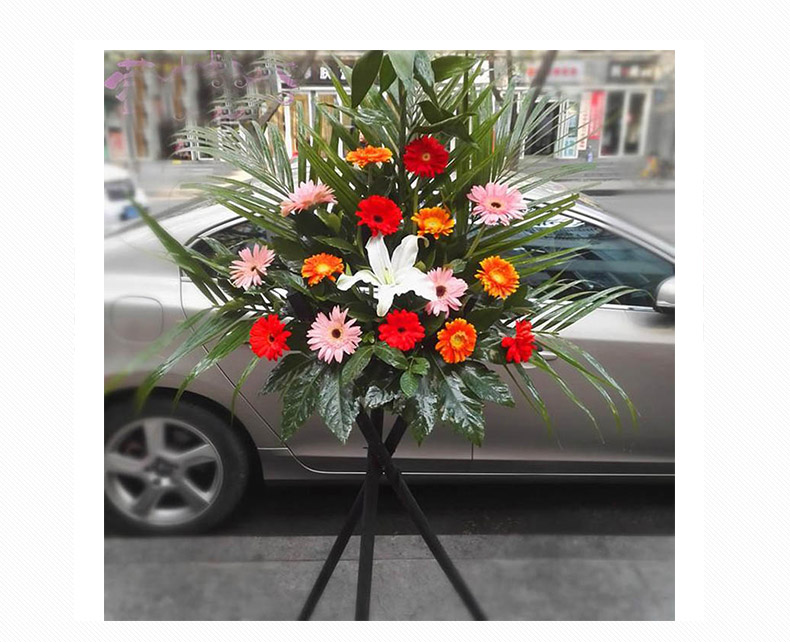 各色扶朗,白百合,散尾葵等花材,包裝:三腳架花籃