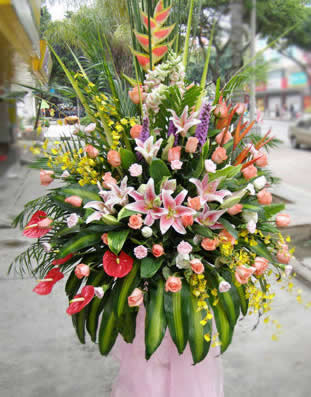 「材 料」 太陽花,玫瑰,百合,跳舞蘭,紅掌,紫羅蘭,蛇鞭菊,大鳥,小鳥,康乃馨,劍葉,巴西葉,襯花、綠葉點綴 「包 裝」 花籃