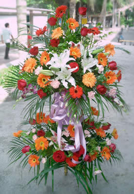 「材 料」 太陽花,玫瑰,百合,康乃馨,洋蘭,襯花、綠葉點綴 「包 裝」 支架雙層花籃