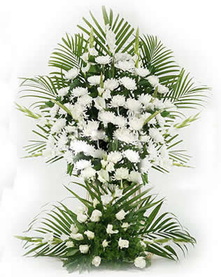 商品簡介:「材 料」 白菊花45支、白色劍蘭15支、白玫瑰17支,散尾葵、蓬萊松、龜背葉; 「包 裝」 雙層花籃