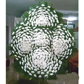 「材 料」 222枝白菊花分成上、中、下、左、右五部分插,外圍大片散尾葵和綠葉。 「包 裝」 花圈支架和花拍。