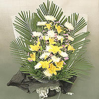 「材 料」 白菊15,黃百合10,勿忘我1扎,散尾葉5片 「包 裝」 手揉紙扇形包裝。