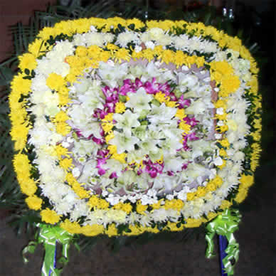 材料包裝: 「材  料」 黃菊花.白菊花,白百合,泰國(guó)蘭,綠葉賠襯 「包  裝」 各式鮮花環(huán)插成圓形花圈.周?chē)G葉圍繞(直徑1.2m左右)