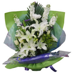 商品簡介:「材 料」 主要花材:百合 「包 裝」 6白百合4支紫羅蘭花束-清明時節(jié)