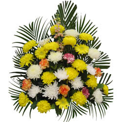 商品簡介: 「材 料」 主要花材:黃菊花、白菊花 「包 裝」 40cm × 40cm 花插參考