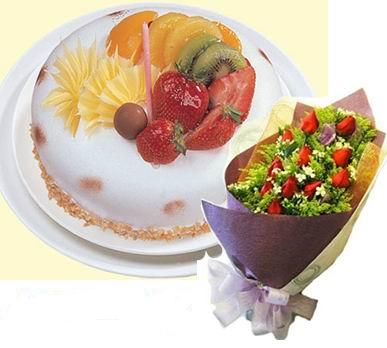 商品簡介:9支紅玫瑰,8寸鮮奶水果蛋糕。