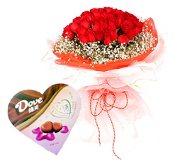 空運A級33朵紅玫瑰,配滿天星。德芙心語巧克力, 法式豪華包裝:紅色卷邊紙,紫色硬紗網和粉色軟紗網包成心型花束