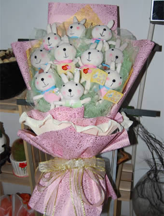 花材:10只卡通兔。 包裝:淺藍(lán)色紗裝飾,黃色、粉色花紋珠光紙,淺粉色卷紙單面包裝,米黃色紗結(jié)。