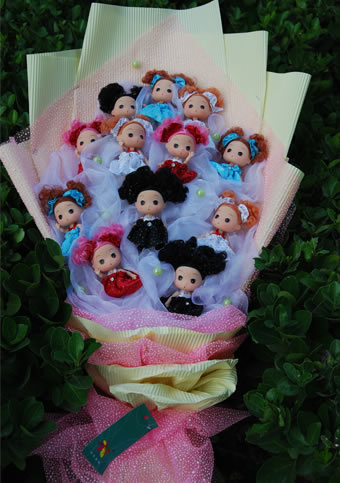 包裝:淺藍色紗、珍珠裝飾,粉色星點紗、淺綠色瓦楞紙單面包裝,紗結。