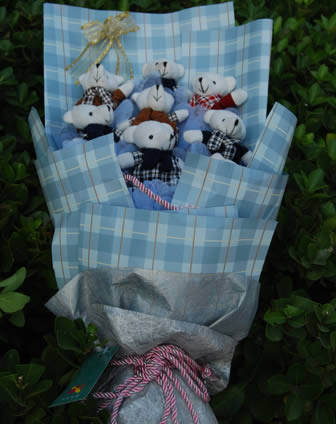 花材:8只卡通小熊。 包裝:淺藍(lán)色紗裝飾,藍(lán)色印花紙單面包裝,配花結(jié)。