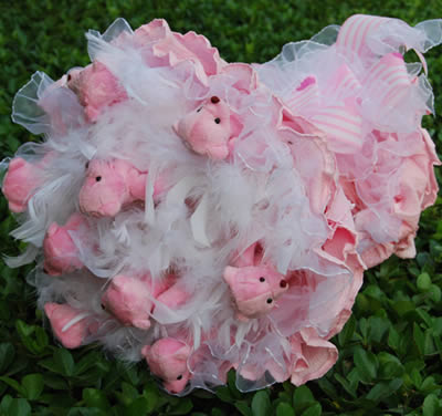 花材:9只粉色小熊。 包裝:白色羽毛裝飾,粉色卷紙圓形包裝,白色紗、粉色棉質(zhì)花結(jié)。