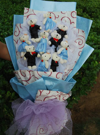 材料包裝: 花材:10只情侶小熊。 包裝:白色紗裝飾,白色花紋紙、藍色包裝紙單面包裝,紫色紗結。
