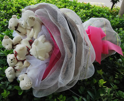 花材:9只卡通白色小熊。 包裝:粉色絲裝飾,紅色皺紋紙、白色紗網(wǎng)圓形花束,配草結(jié)。