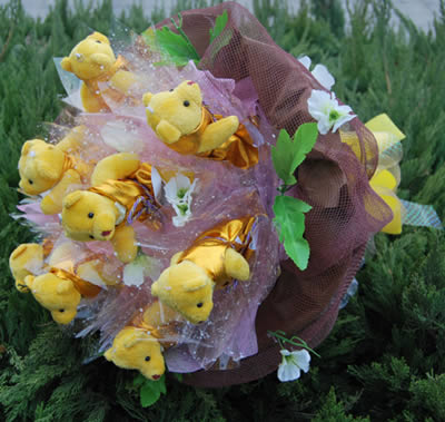 包裝:棕色皺紋紙圓形包裝,紗網外圍,玻璃紙內襯,黃色面絲帶扎結