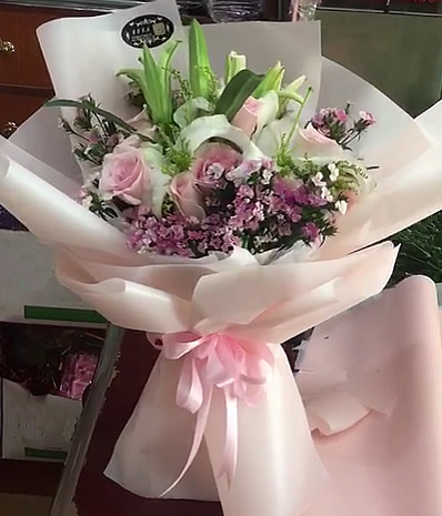 19支粉色玫瑰,2支白百合,淡色包裝紙精美高檔包裝