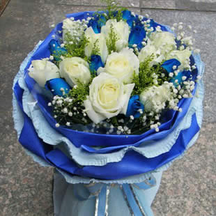 9支白色玫瑰9支藍色妖姬,圓形包裝
