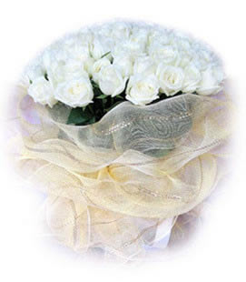 商品簡介:33支白色玫瑰,圓形包裝,淡黃色網紗圓形高檔包裝