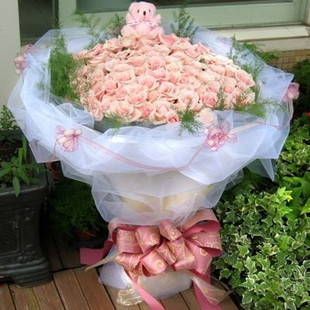 花材:99支粉玫瑰,綠葉點(diǎn)綴 包裝:白色網(wǎng)紗包裝,彩色蝴蝶結(jié)結(jié)扎