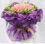 材料包裝: 花材:33支粉色玫瑰,綠葉豐滿搭配 包裝:紫色網(wǎng)紗包裝,圓形精美包裝