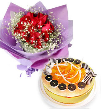 商品簡介:9支紅玫瑰,滿天星圍邊,紫色包裝 10寸水果蛋糕
