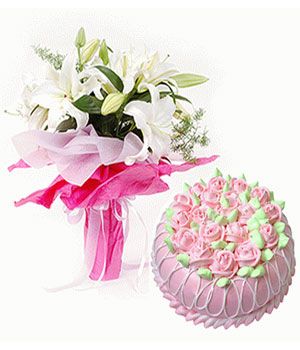 5支多頭百合,圓形韓式包裝 8寸鮮奶蛋糕