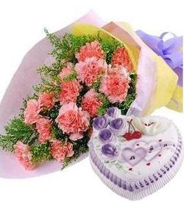 商品簡(jiǎn)介:16支粉色康乃馨,黃鶯單面包裝 10寸心形蛋糕