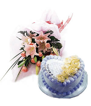 2支多頭粉色百合,9支粉色玫瑰,淡色包裝 10寸心型蛋糕