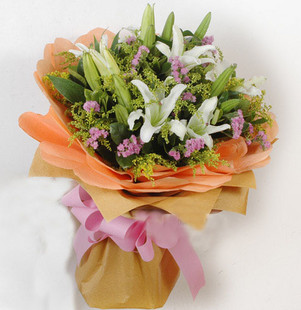 商品簡介:4支多頭香水百合,黃鶯搭配,包裝紙精美包裝