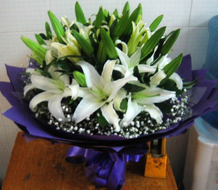 商品簡介:白色多頭香水百合7支,滿天星圍邊