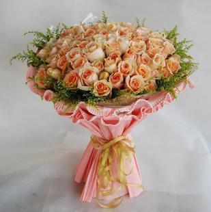 66支香檳玫瑰,黃鶯圍邊,橘色卷邊紙包裝