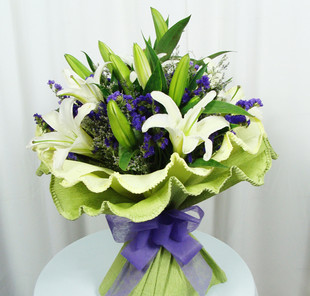 商品簡介:3支多頭白色香水百合,勿忘我點綴,綠色卷邊紙包裝