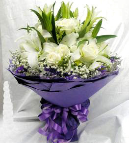 商品簡介:3支多頭白色香水百合,11支白色玫瑰,滿天星搭配,紫色圓形包裝