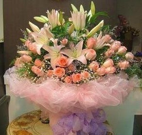 33支粉色玫瑰,3支多頭粉色百合,滿天星綠葉圓形粉色網(wǎng)紗包裝