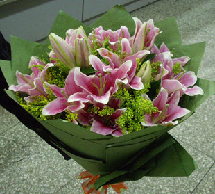 商品簡介:9支多頭粉色百合,黃鶯豐滿,圓形包裝