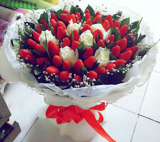 7支白色玫瑰,33顆草莓,草莓只有冬天才有噢,白色皺紋紙包裝