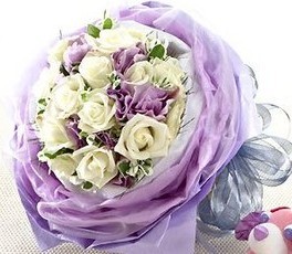 商品簡介:12支白玫瑰,紫色桔梗,圓形紫色包裝
