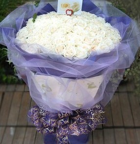 商品簡(jiǎn)介:99支白色玫瑰,紫色網(wǎng)紗包裝