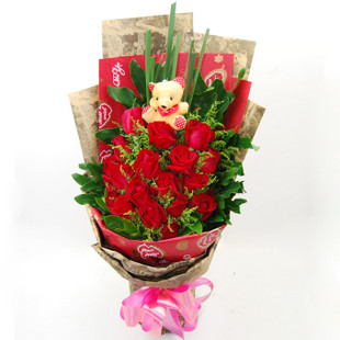 19枝昆明A組紅玫瑰,黃鶯,配葉點綴,精美豪華單面包裝,附送一只小熊公仔