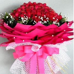 99朵紅玫瑰.點(diǎn)綴滿天星、綠葉。 [包 裝]:皺紋紙圓形精美包裝,配蝴蝶結(jié)束扎。